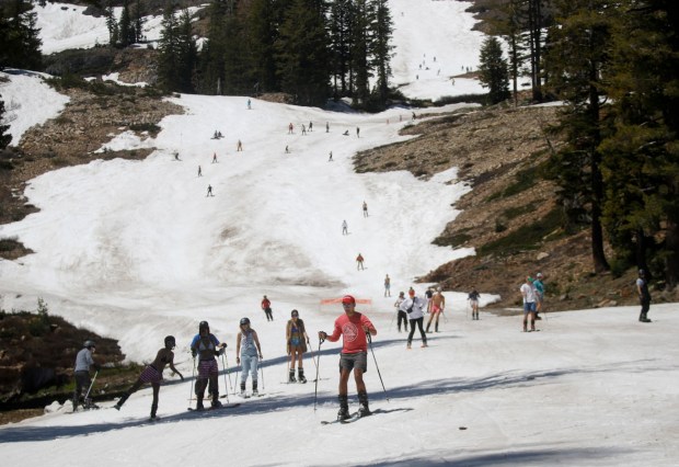 Skiers wearing shorts frolicked at Lake Tahoe on July 4th. Mammoth Mountain ski area in the Southern Sierra is open this weekend.