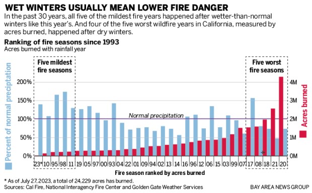While fire agencies often warn that extra rain can help fuel fire danger, an analysis of 30 years of rainfall and wildfire records by the Bay Area News Group shows that wildfire risk in California is much higher after dry winters, and lower after wet winters like this year’s.